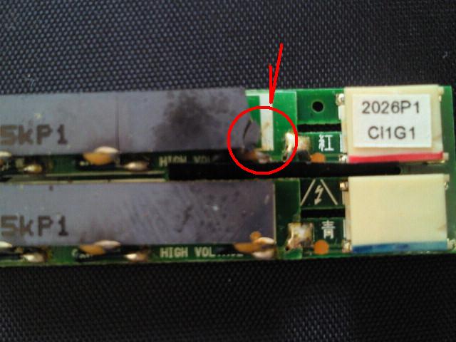 写真の赤丸部分が割れて焦げている。これはインバータ基板を交換するしか手はない。