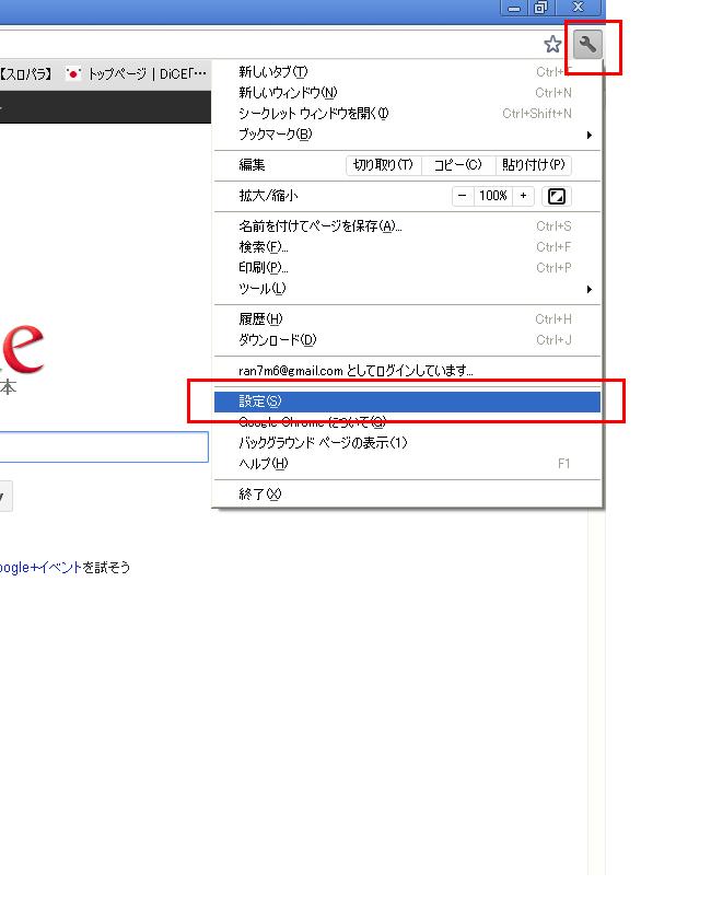 まずChromeを立ち上げて、右上のスパナのマークをクリック。