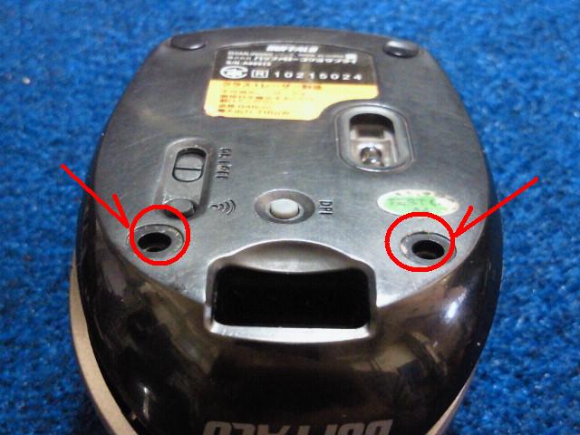 かなり汚れています。底面の赤丸部分のビス2本を外します。